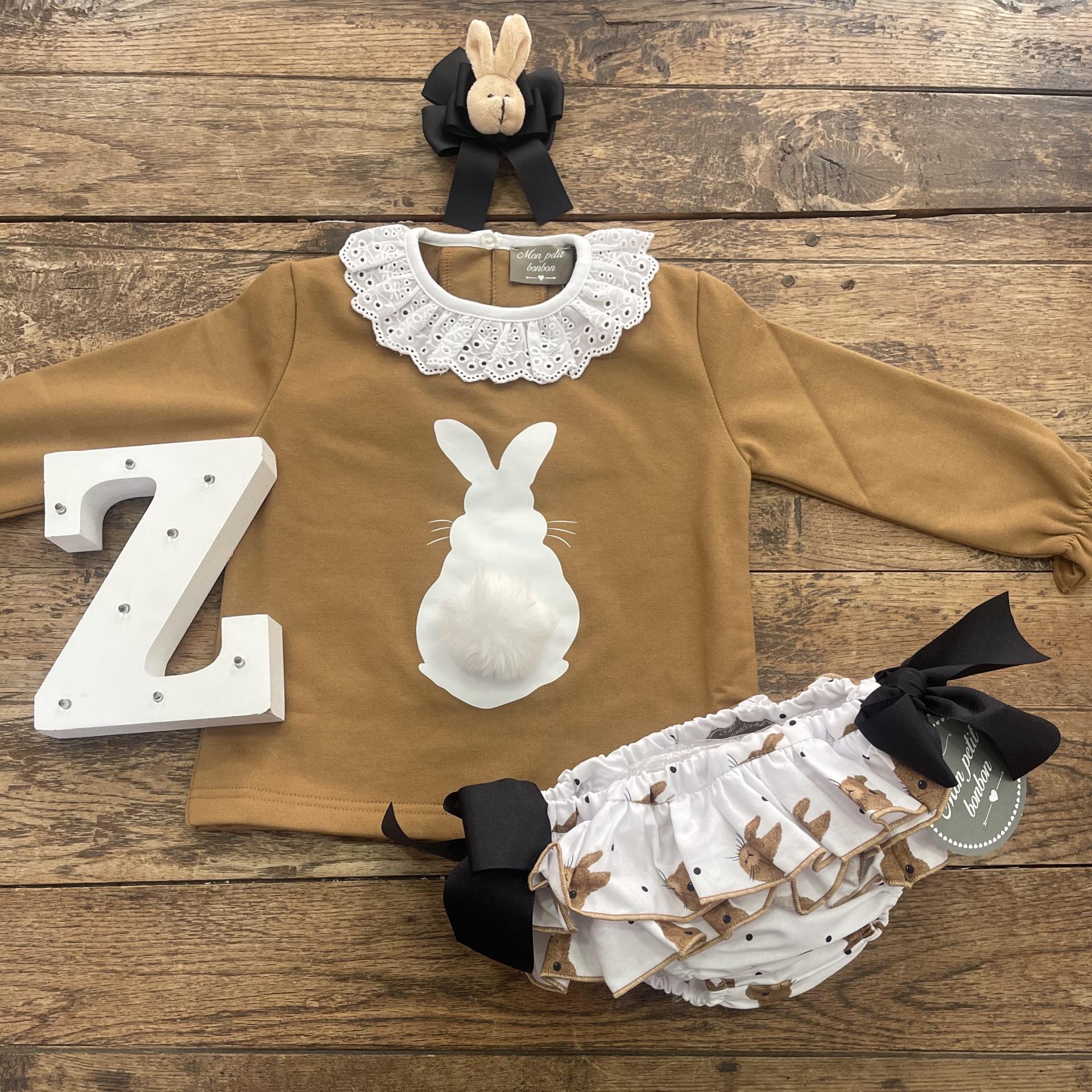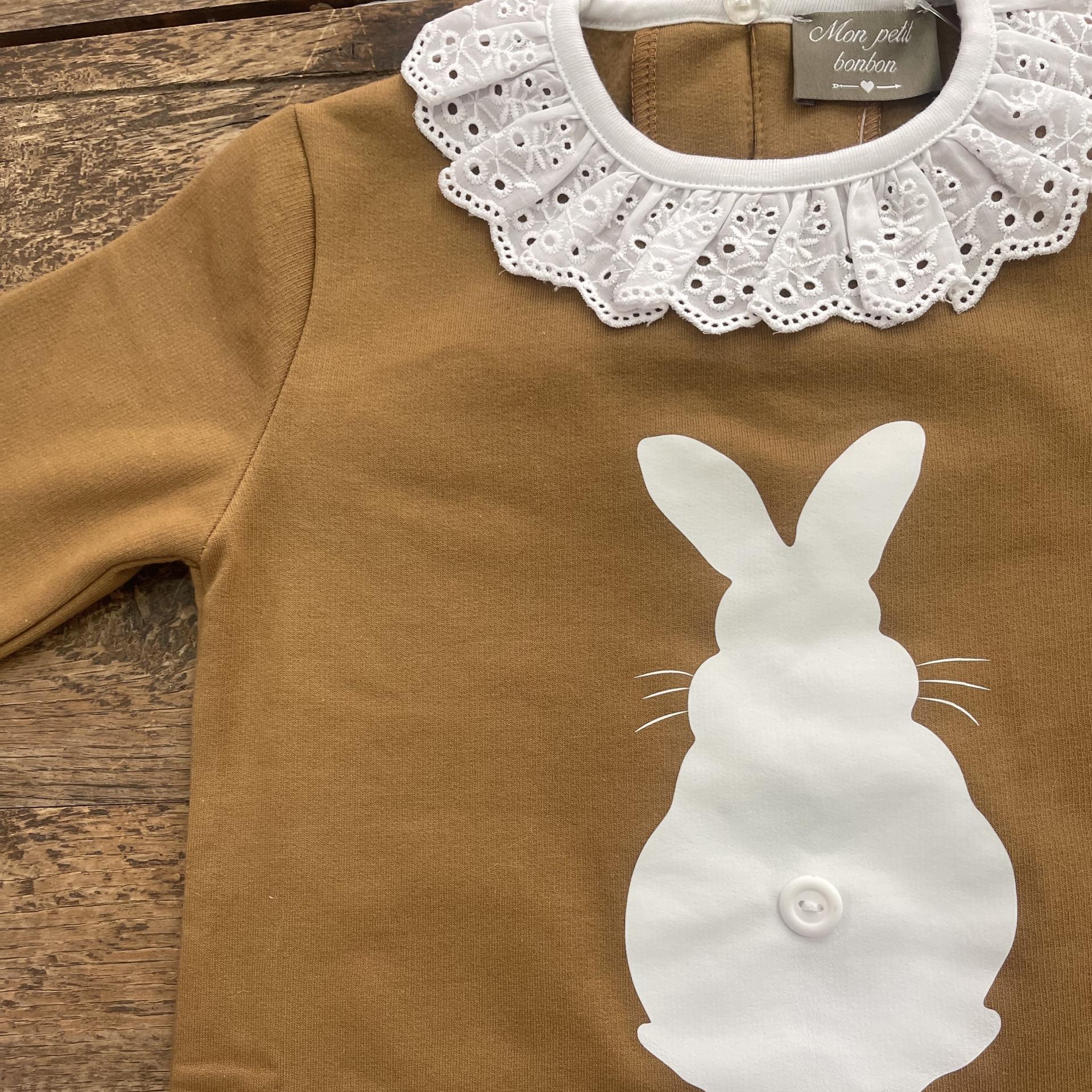 Sudadera niña, felpa. Camel. Cuello blanco volante. Silueta blanca conejo, rabito pompón. Botón en la sudadera para poder poner y quitar el pompón y así facilitar su lavado