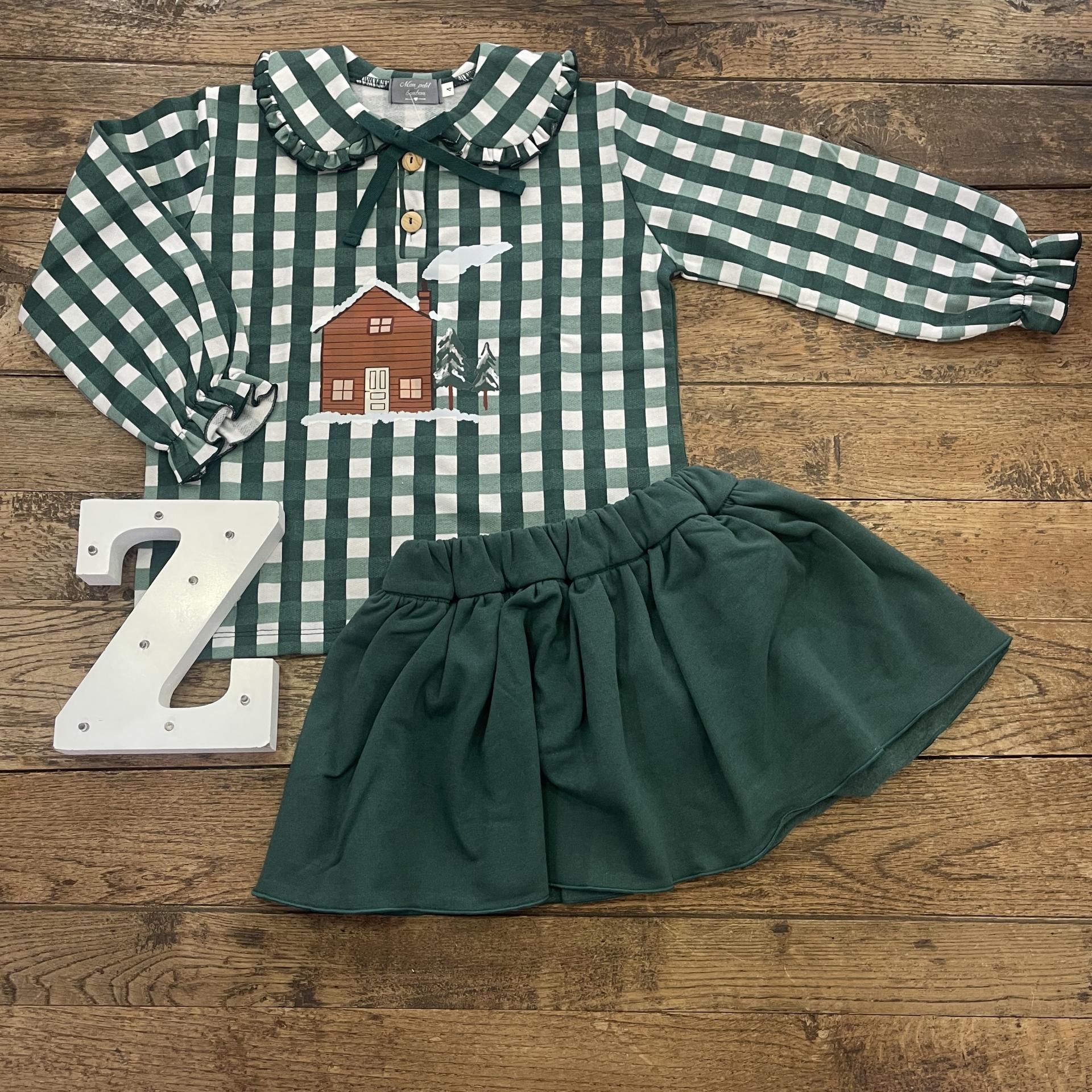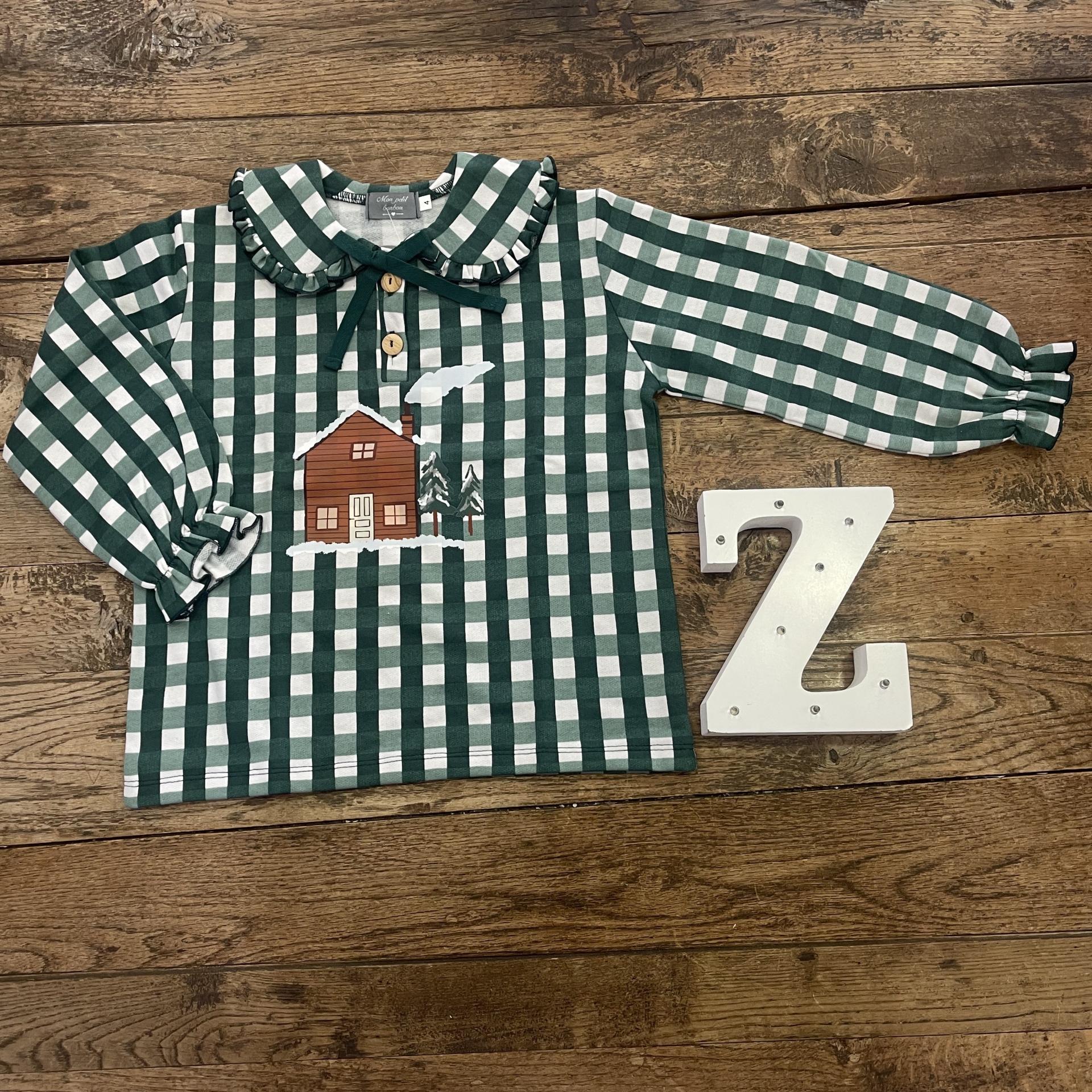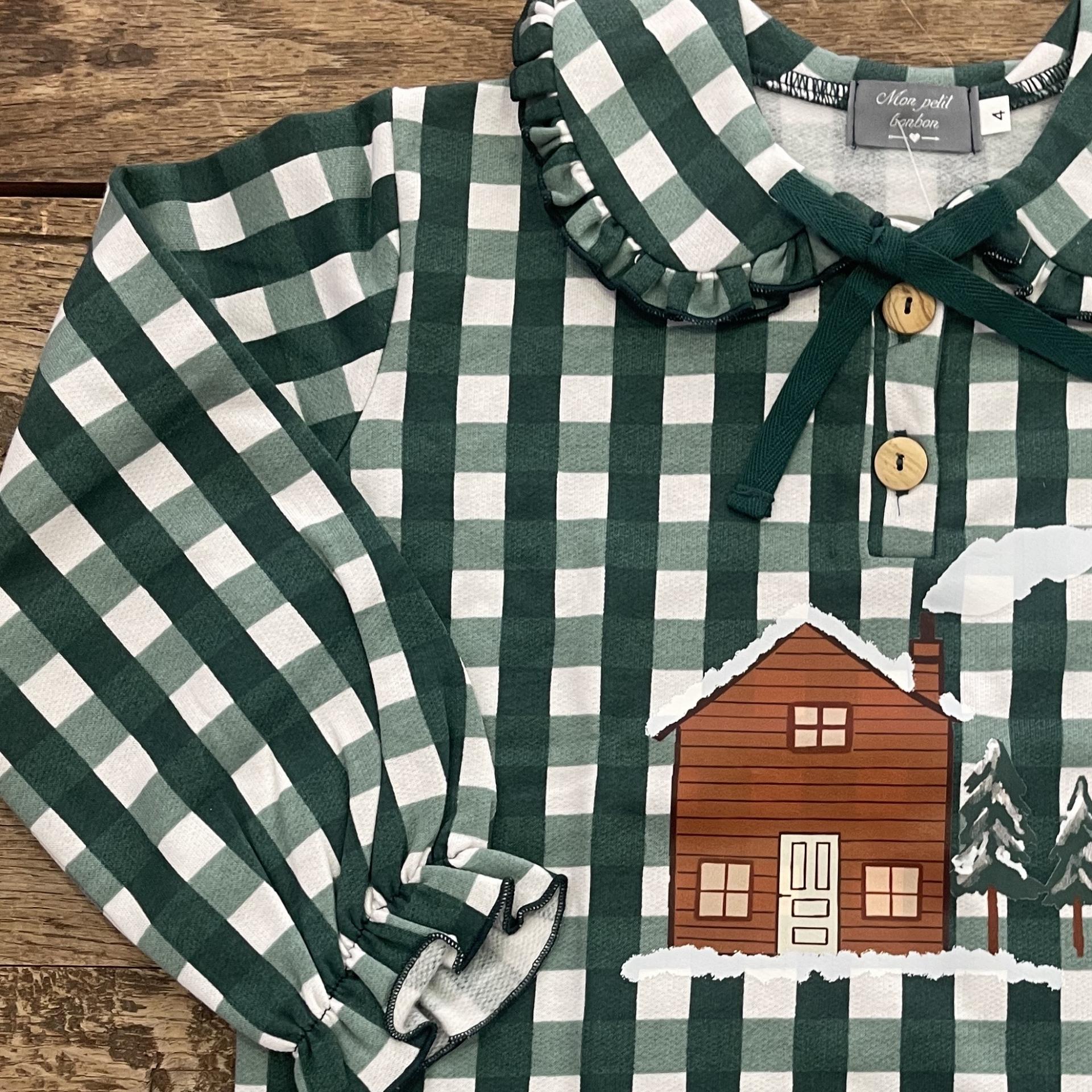Sudadera felpa, niña. Cuello bebé con ribete volante. Cuadros en verde y blanco. Casita