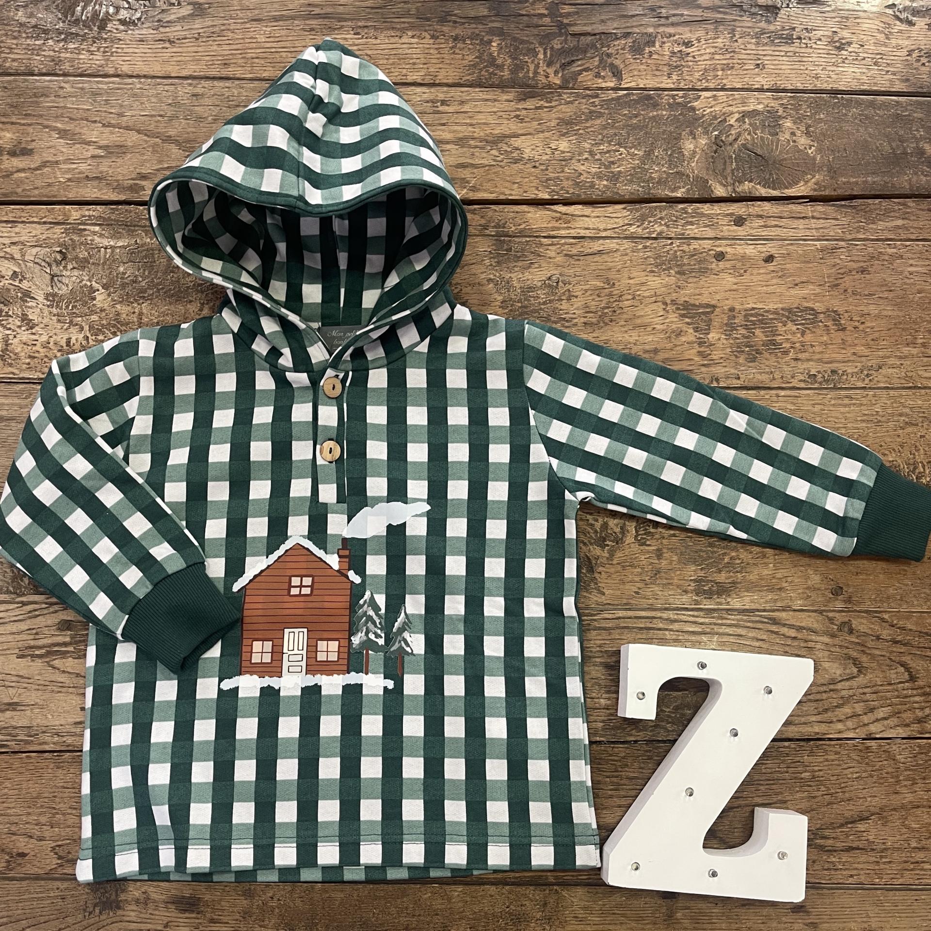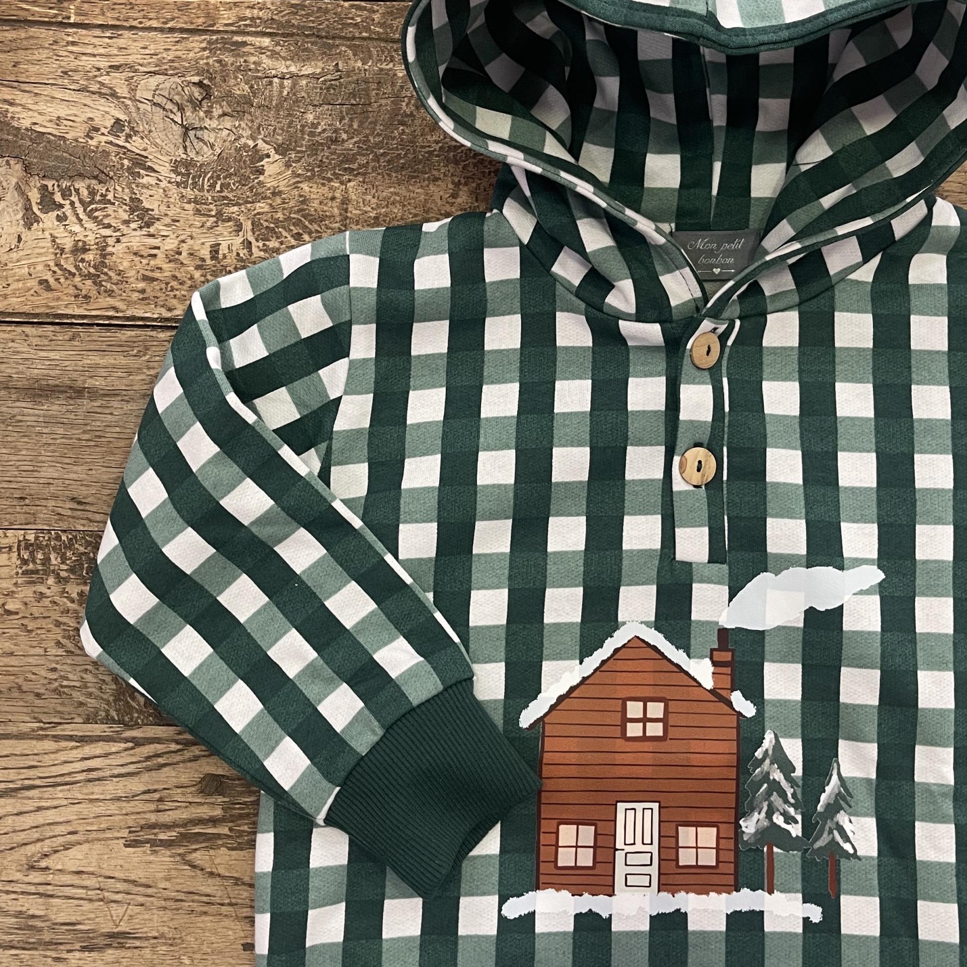 Sudadera felpa, niño. Cuadros verde y blanco. Capucha. Casita
