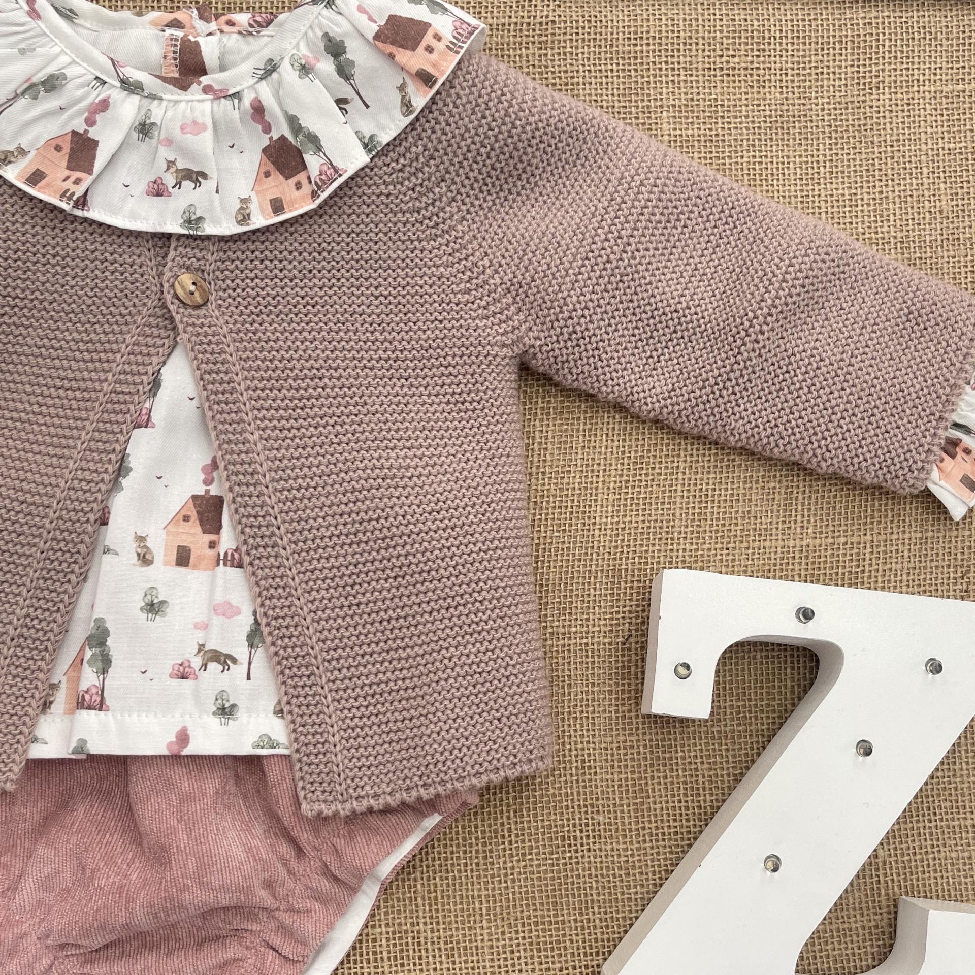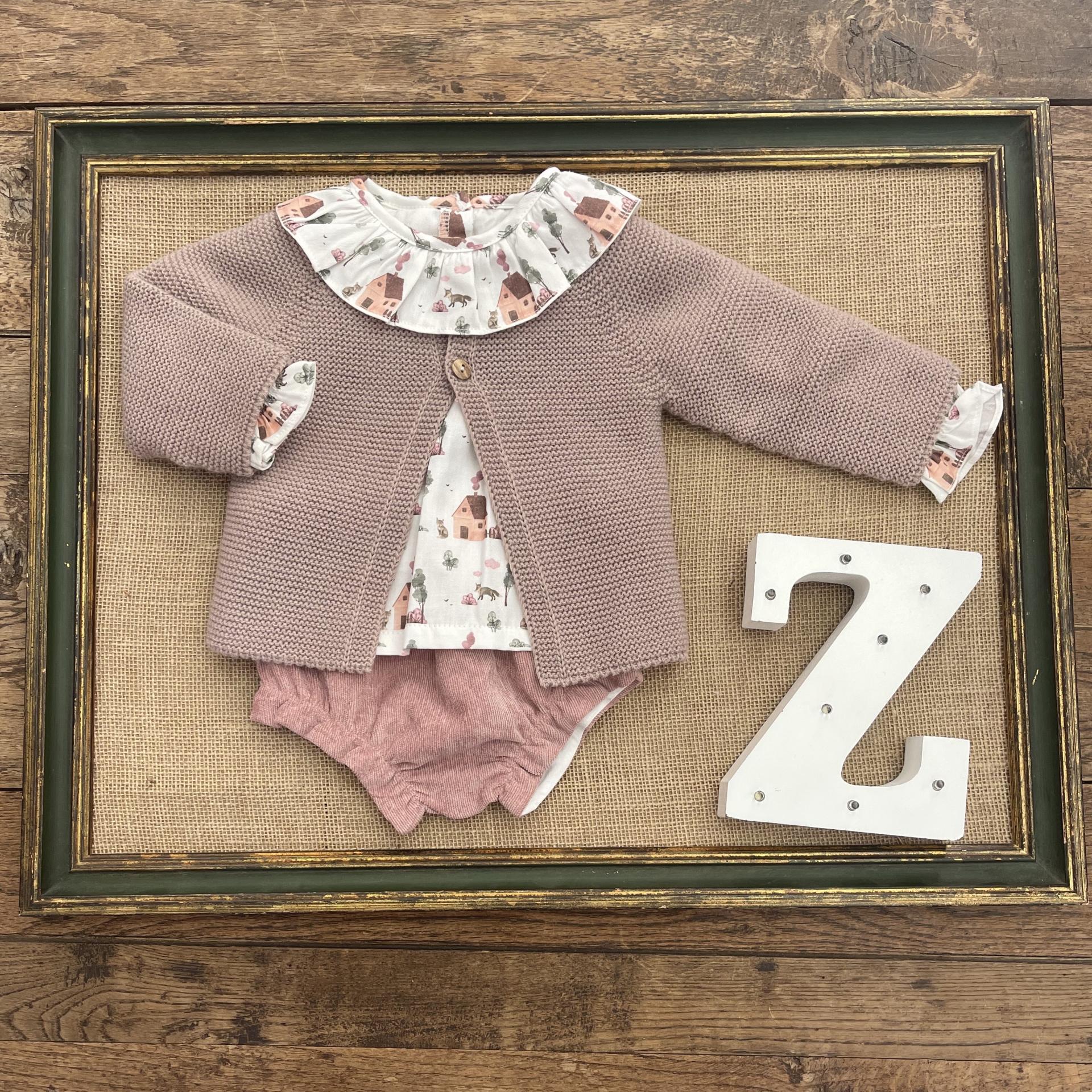 Conjunto bebé, inña. Tres piezas: blusa casitas cuello volante, braguita micropana rosa maquilaje, chaqueta punto beige oscuro