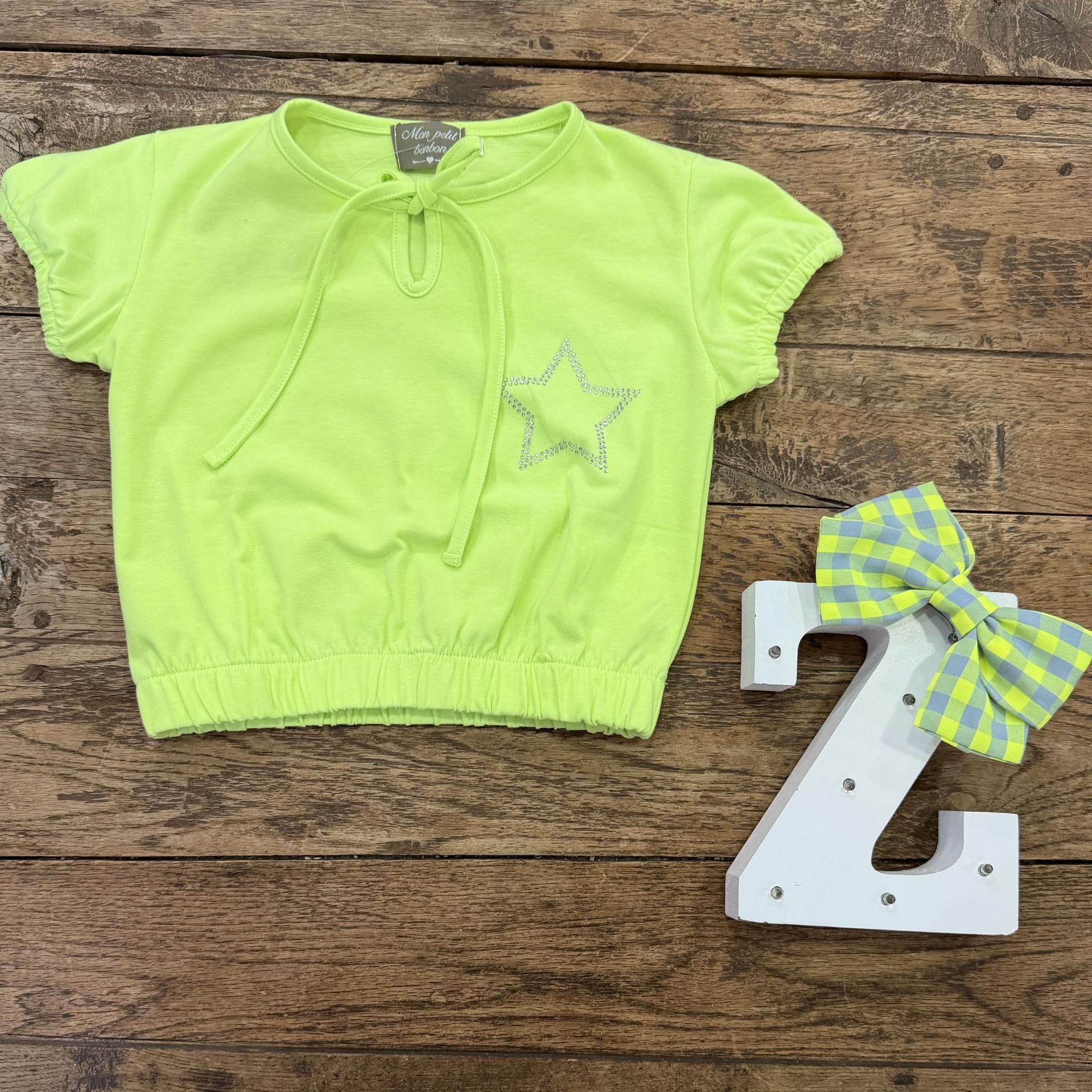 Camiseta niña,corta, algodón. Verde flúor. Estrella plata