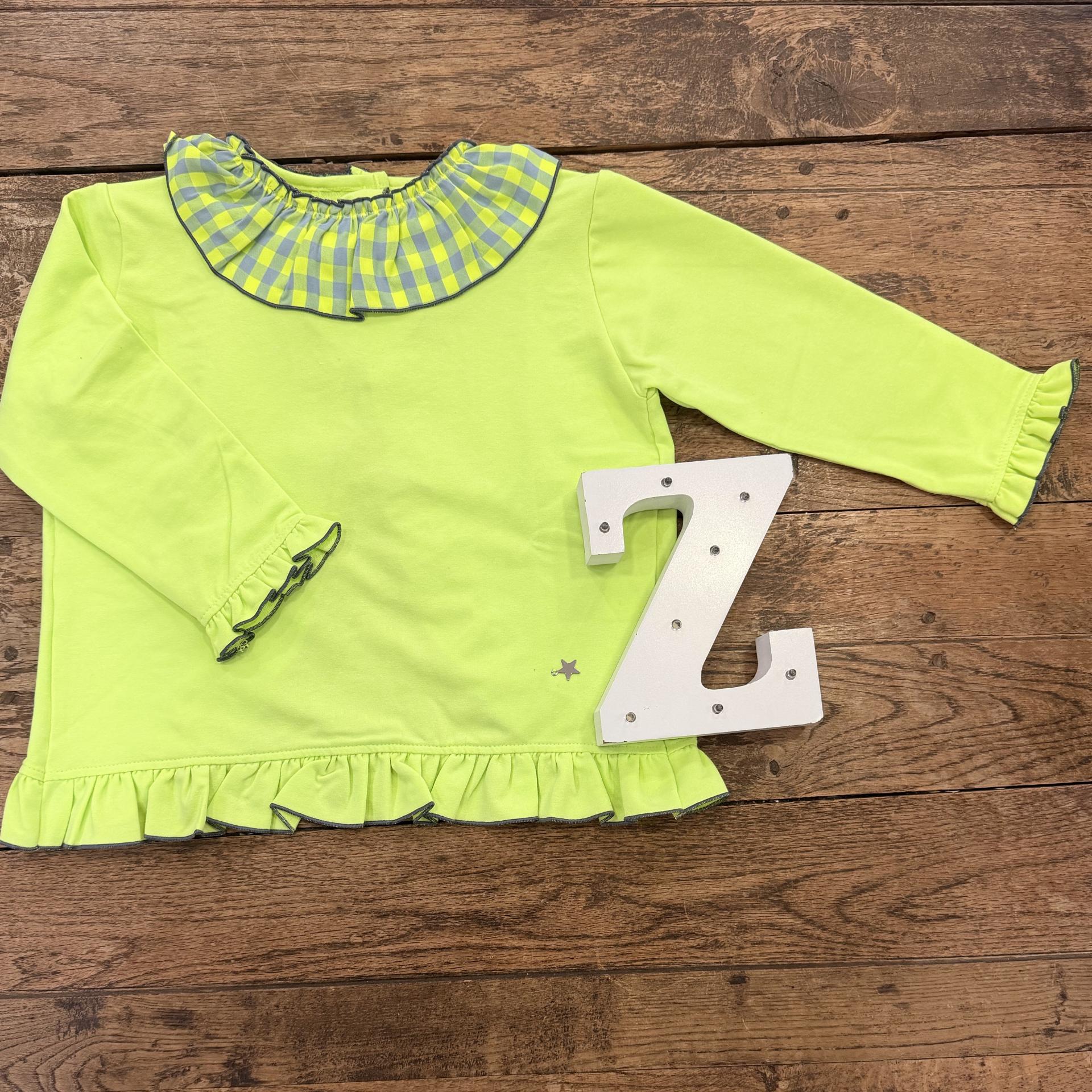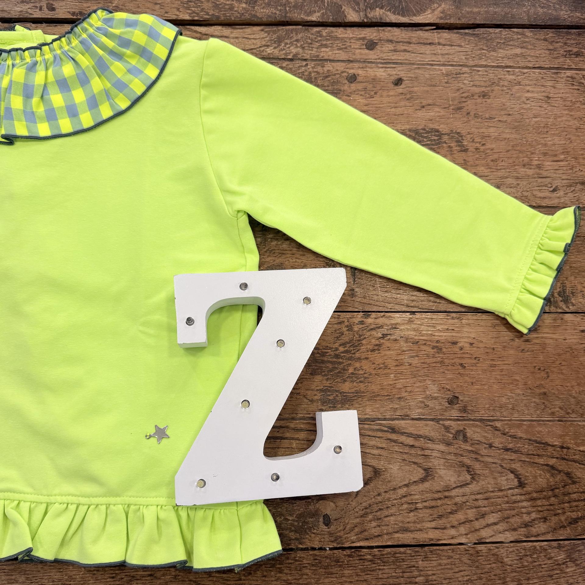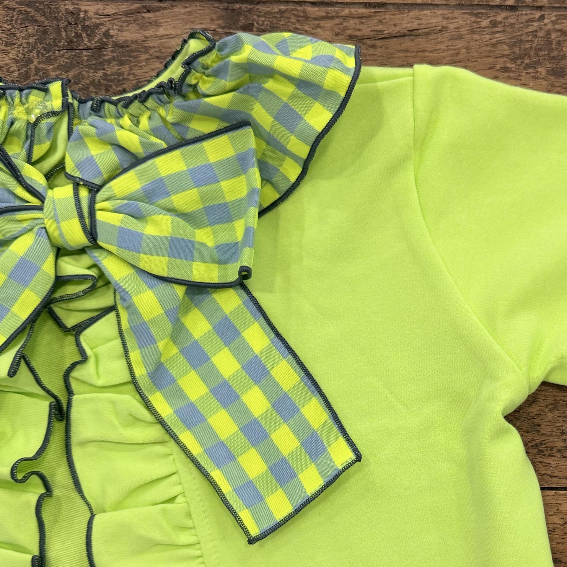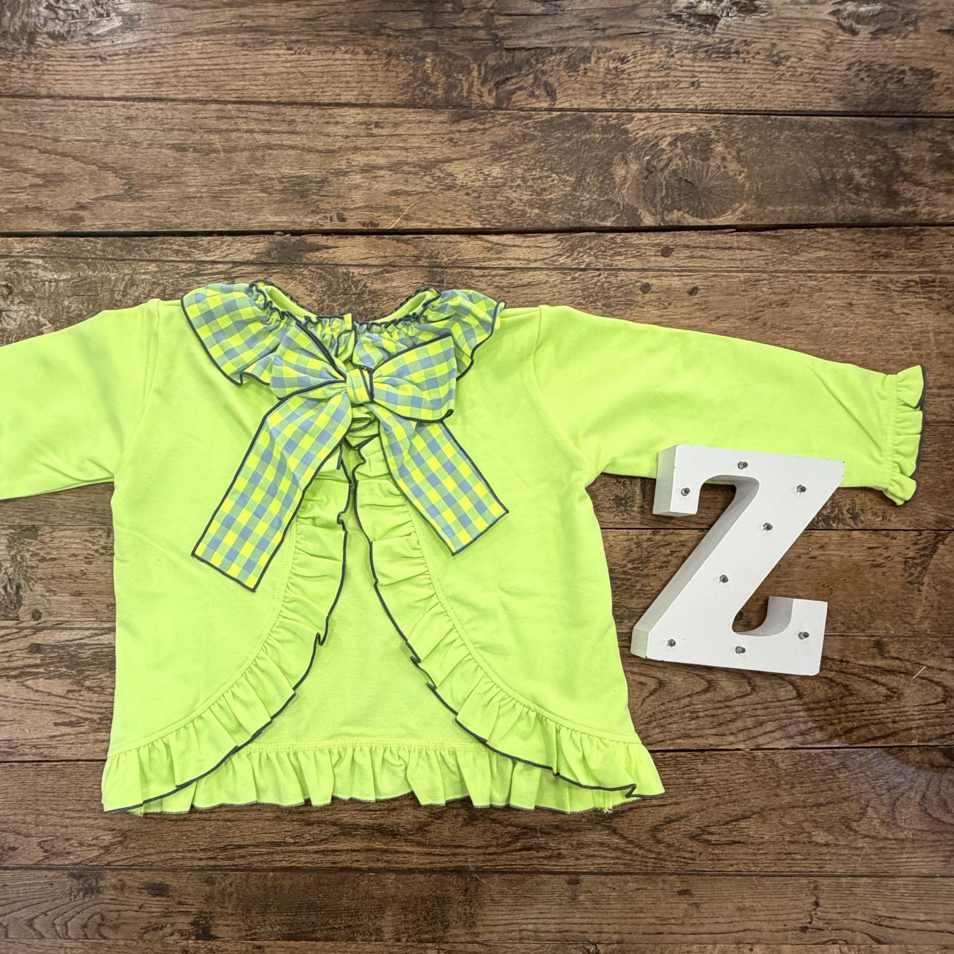 Sudadera niña, felpa, amarillo flúor y gris. Bespalada abierta, lazada vichy. Cuello volante.