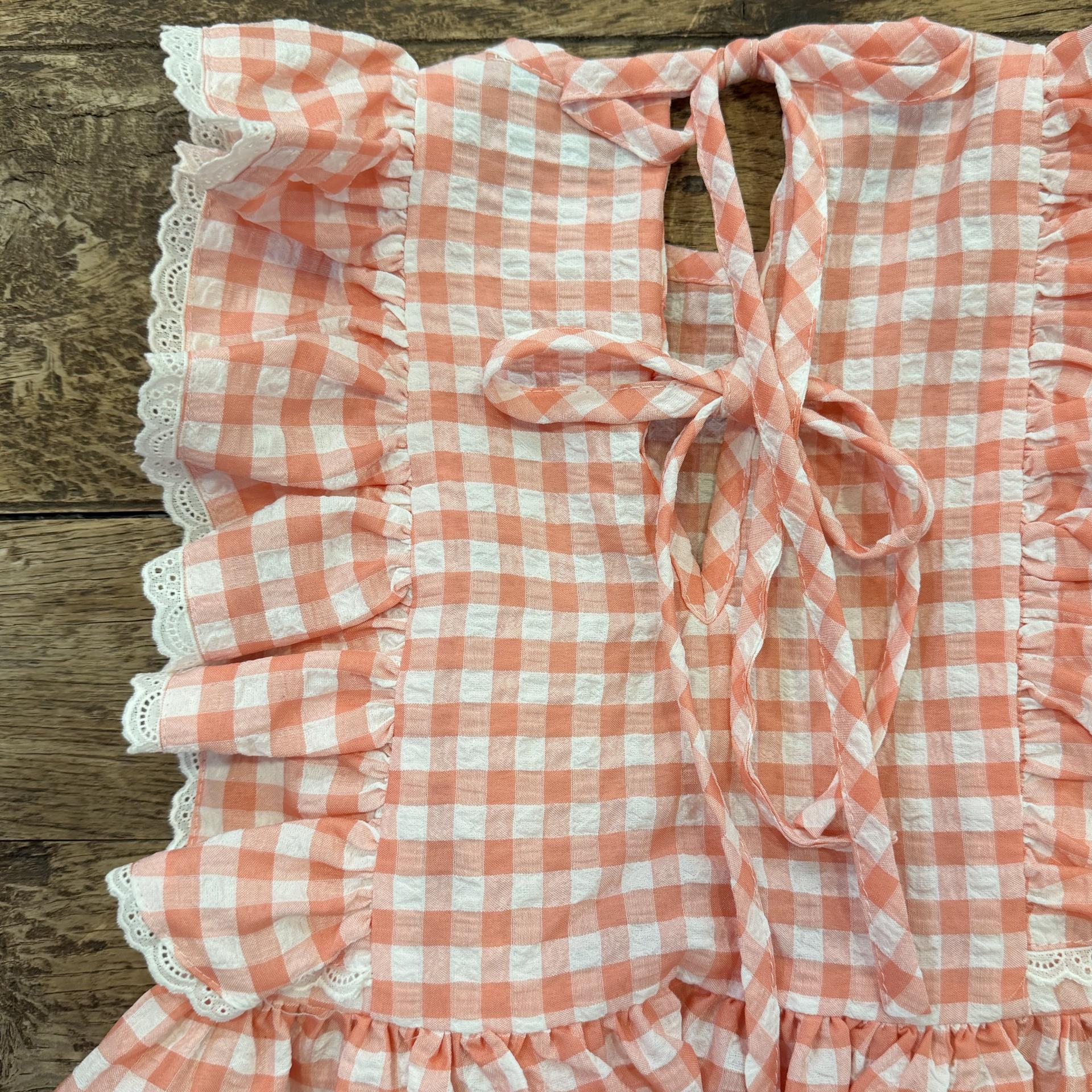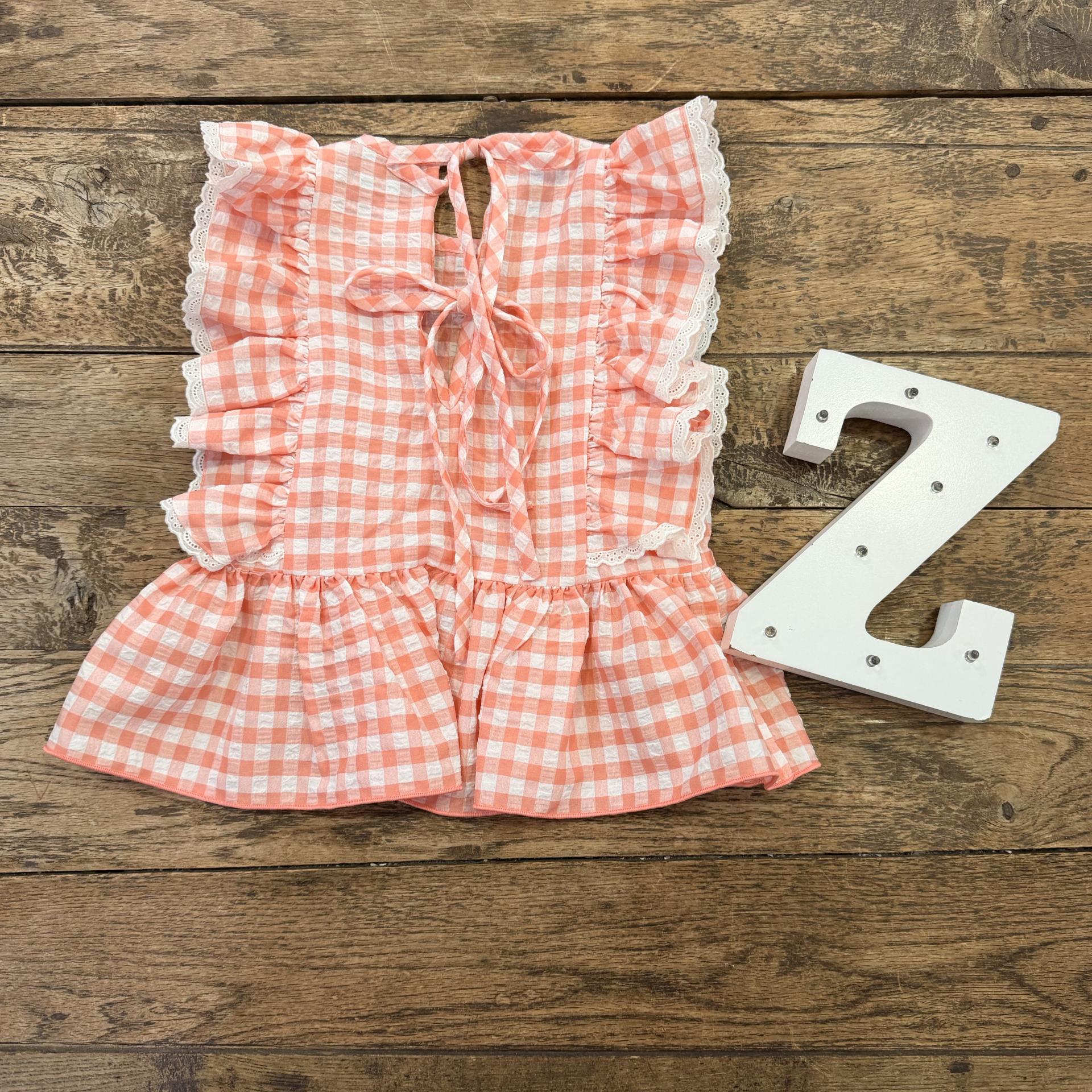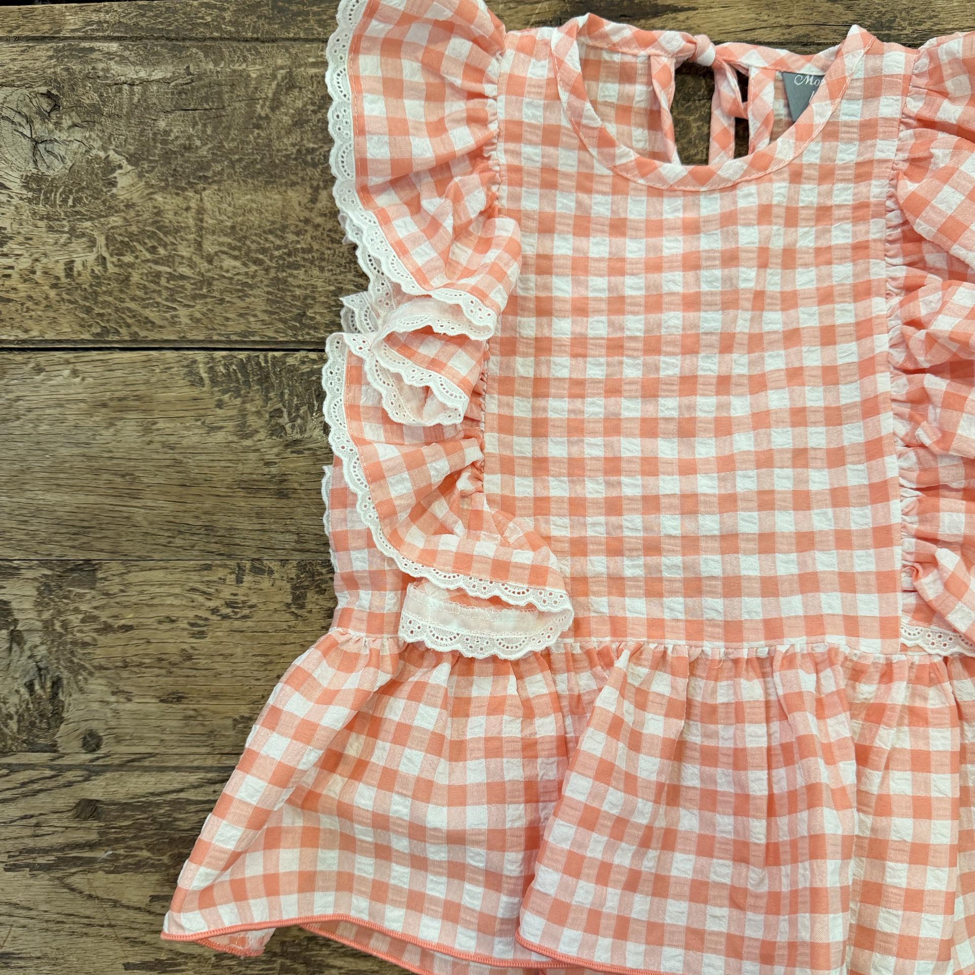 Blusa niña. Vichy melocotón. Volantes. Espalda lazadas.