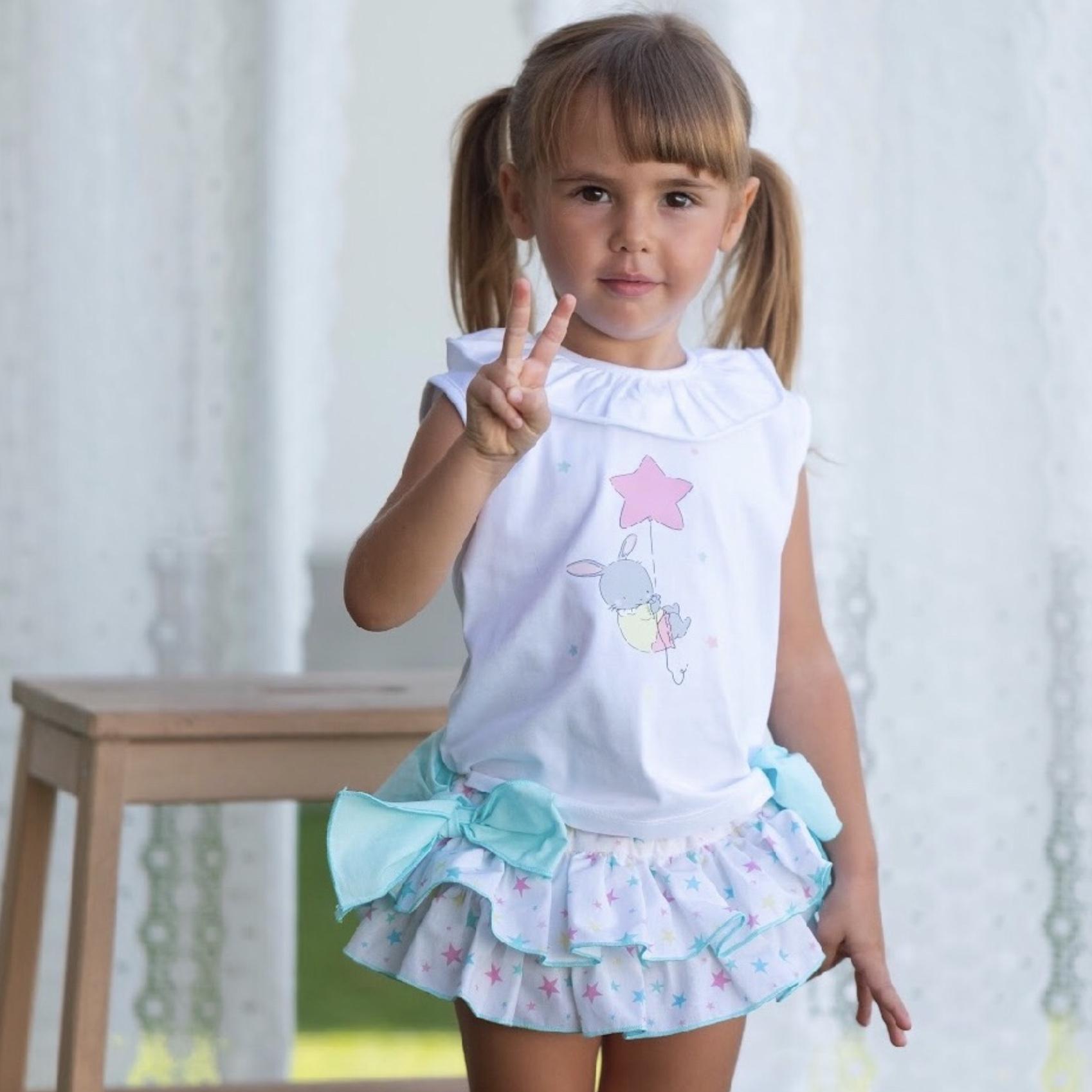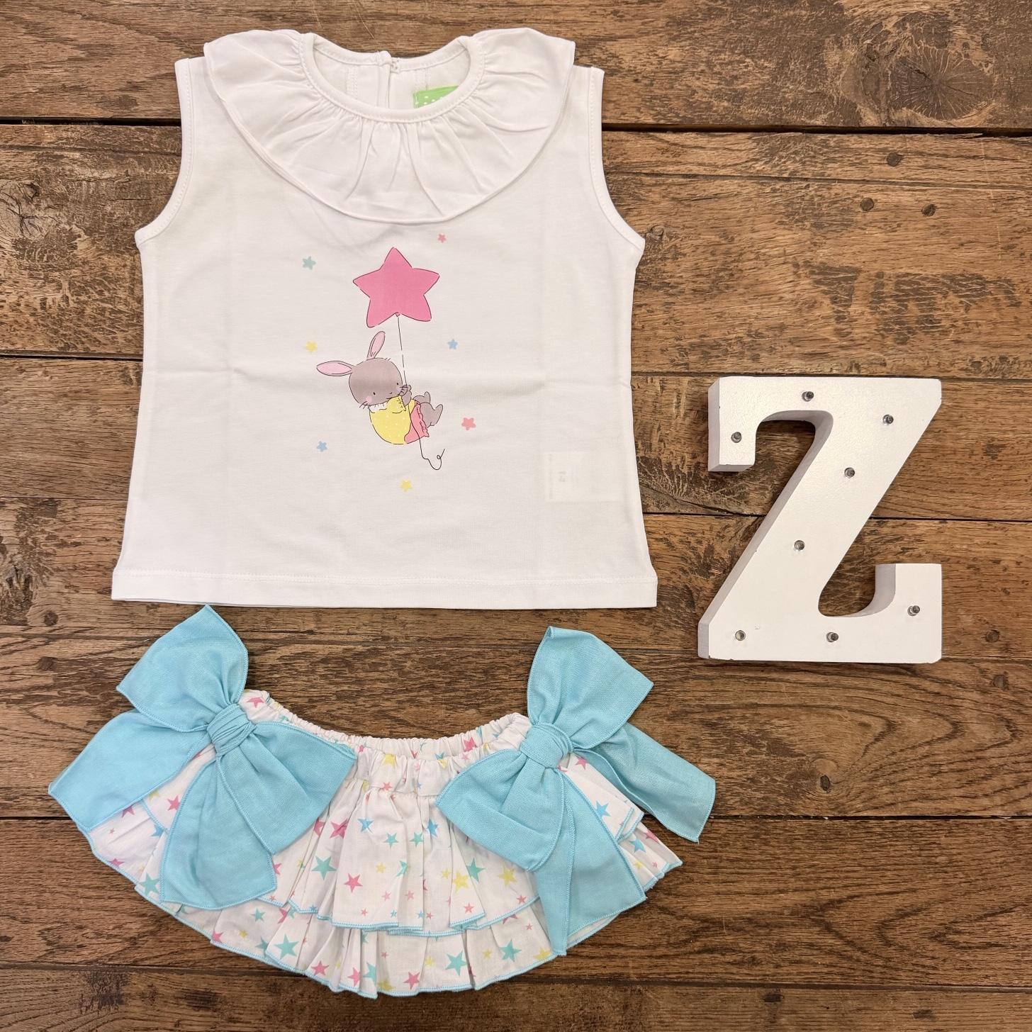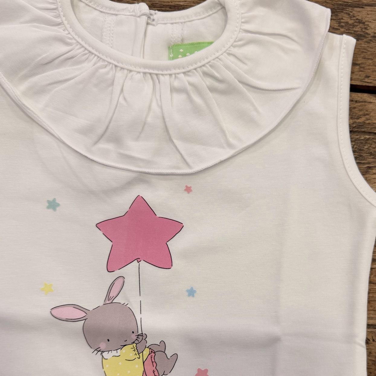 Conjunto dos piezas: Camiseta blanca, cuello volante, sin mangas, conejito estampado. Braguita volantes, estrellas colores, lazos verde agua