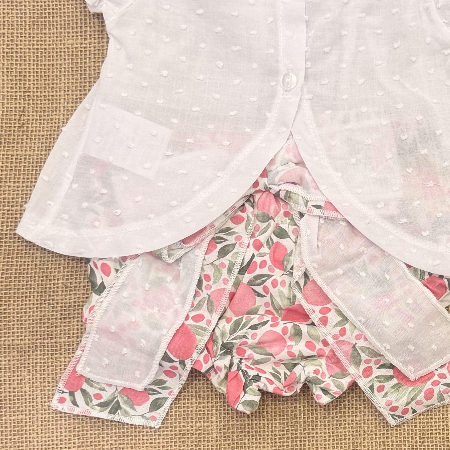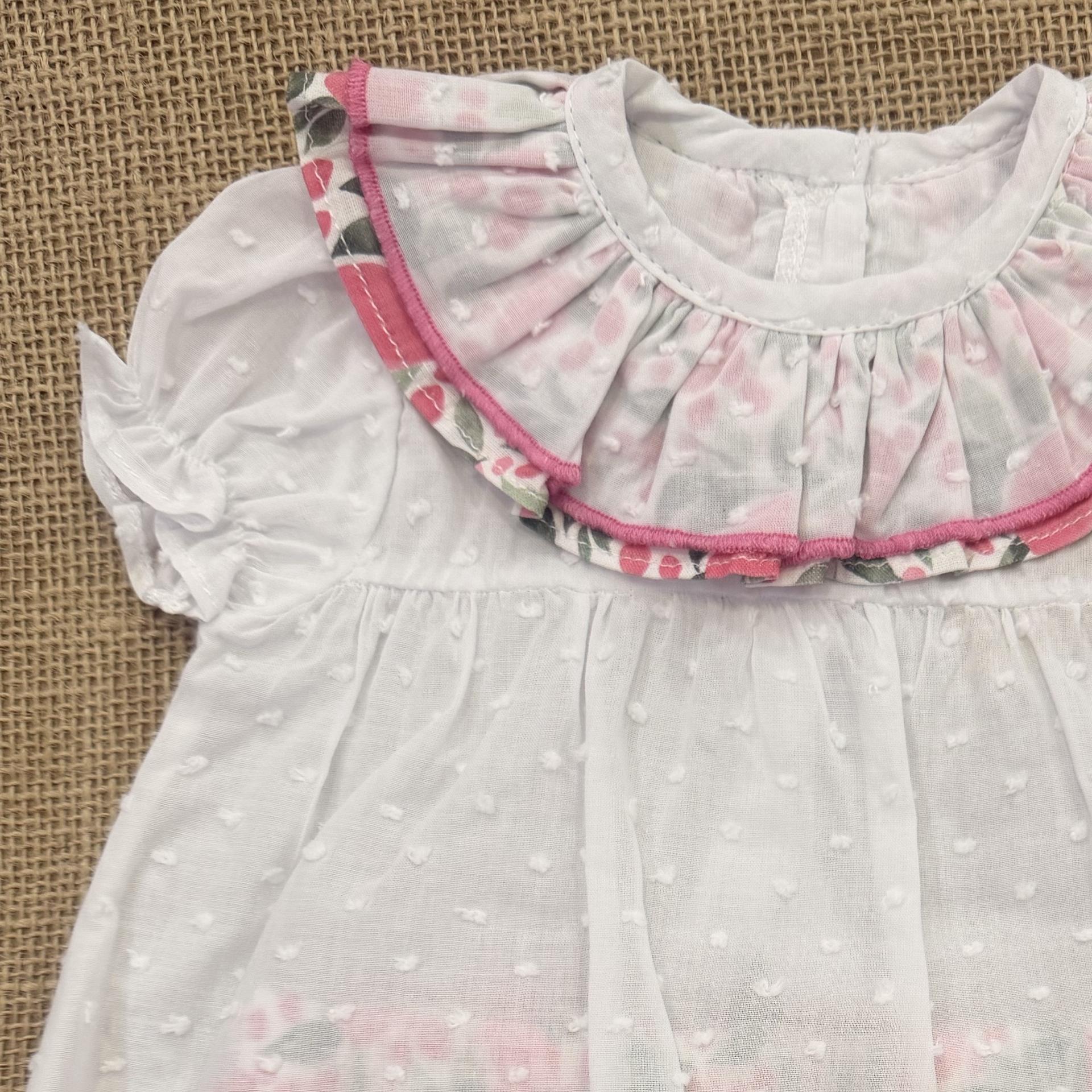 Conjunto bebé, niña. Blusa blanca plumeti, cuello volantes, manga corta. Braguit flores rosa, con lazo en el culete.