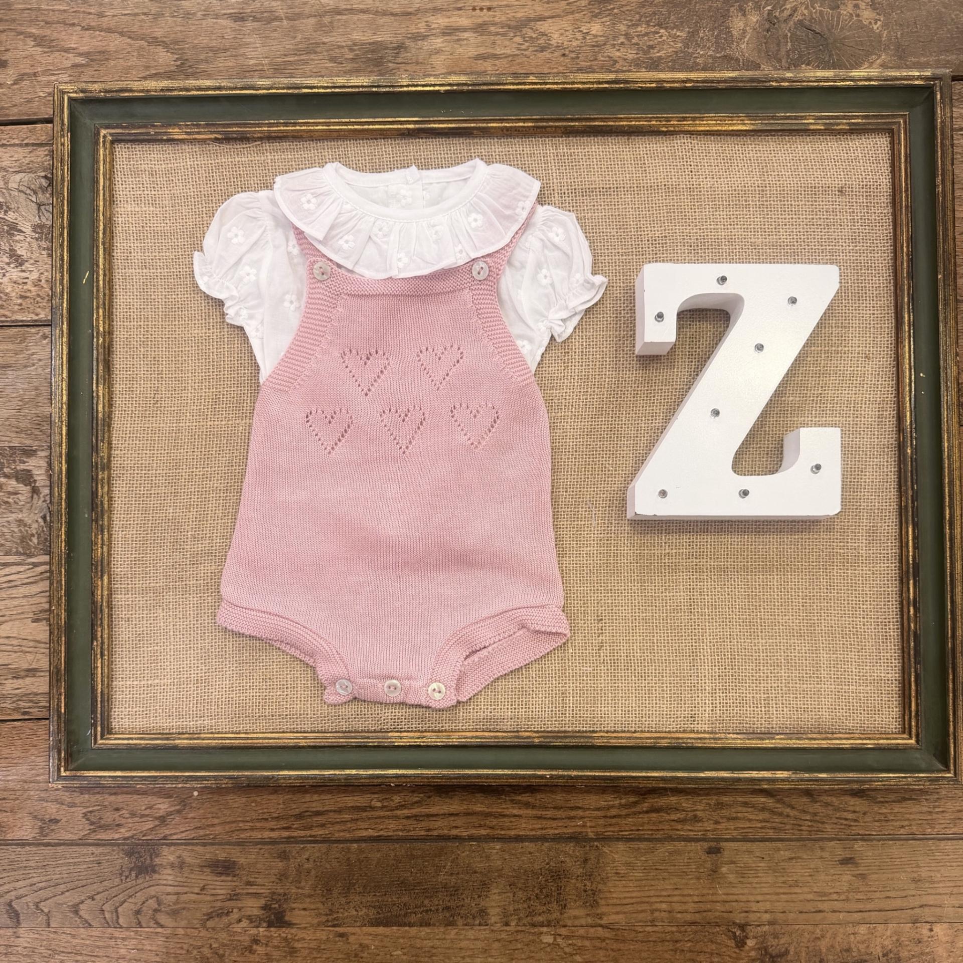 Conjunto bebé, niña. Blusta blanca, flores bordadas, cuello volante, manguita corta. Peto punto rosa empolvado