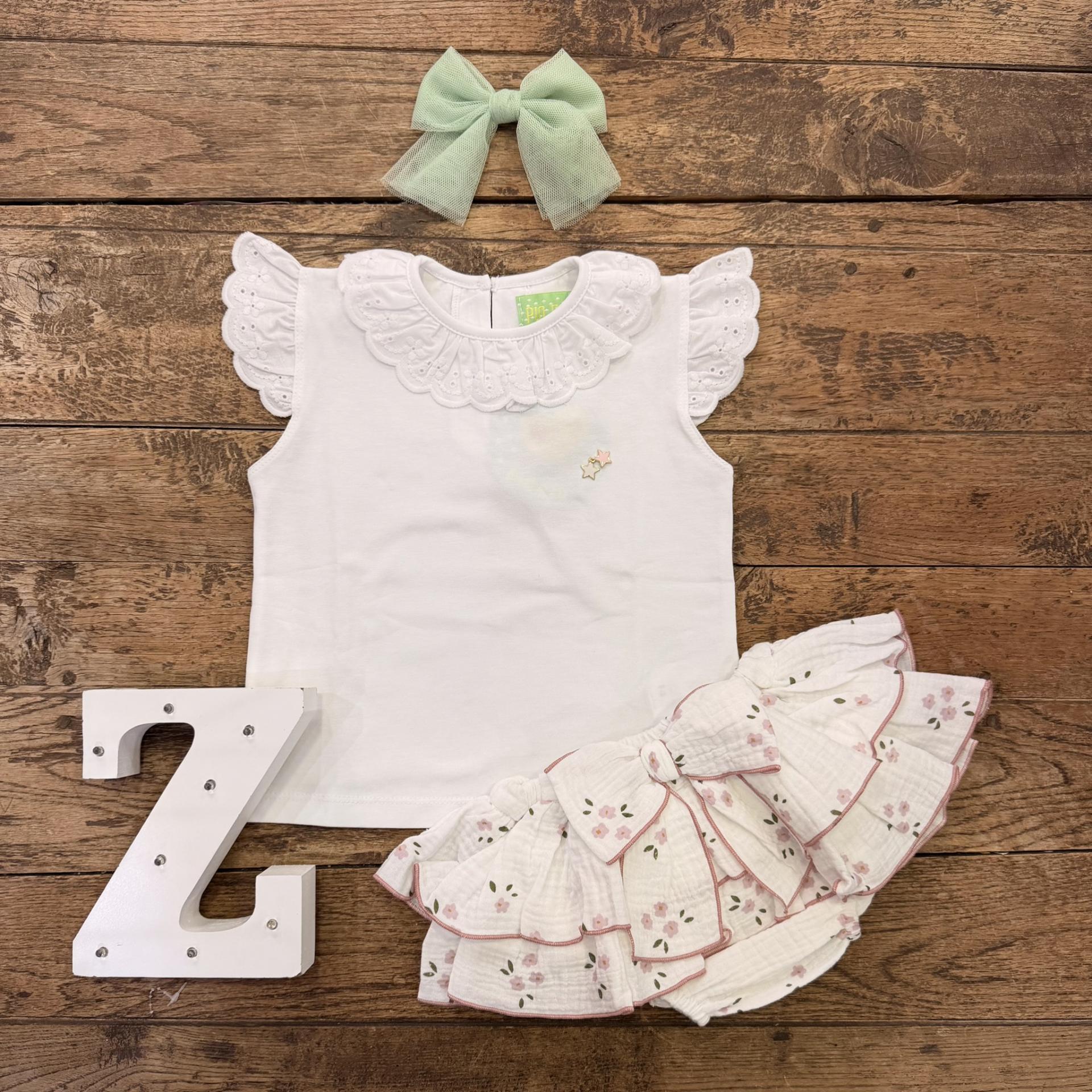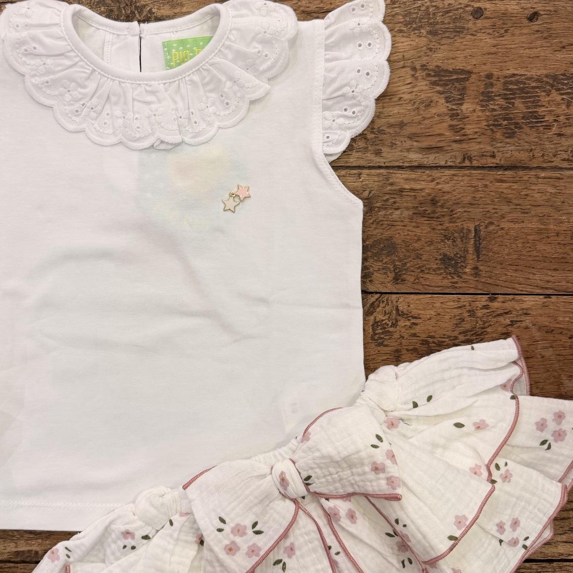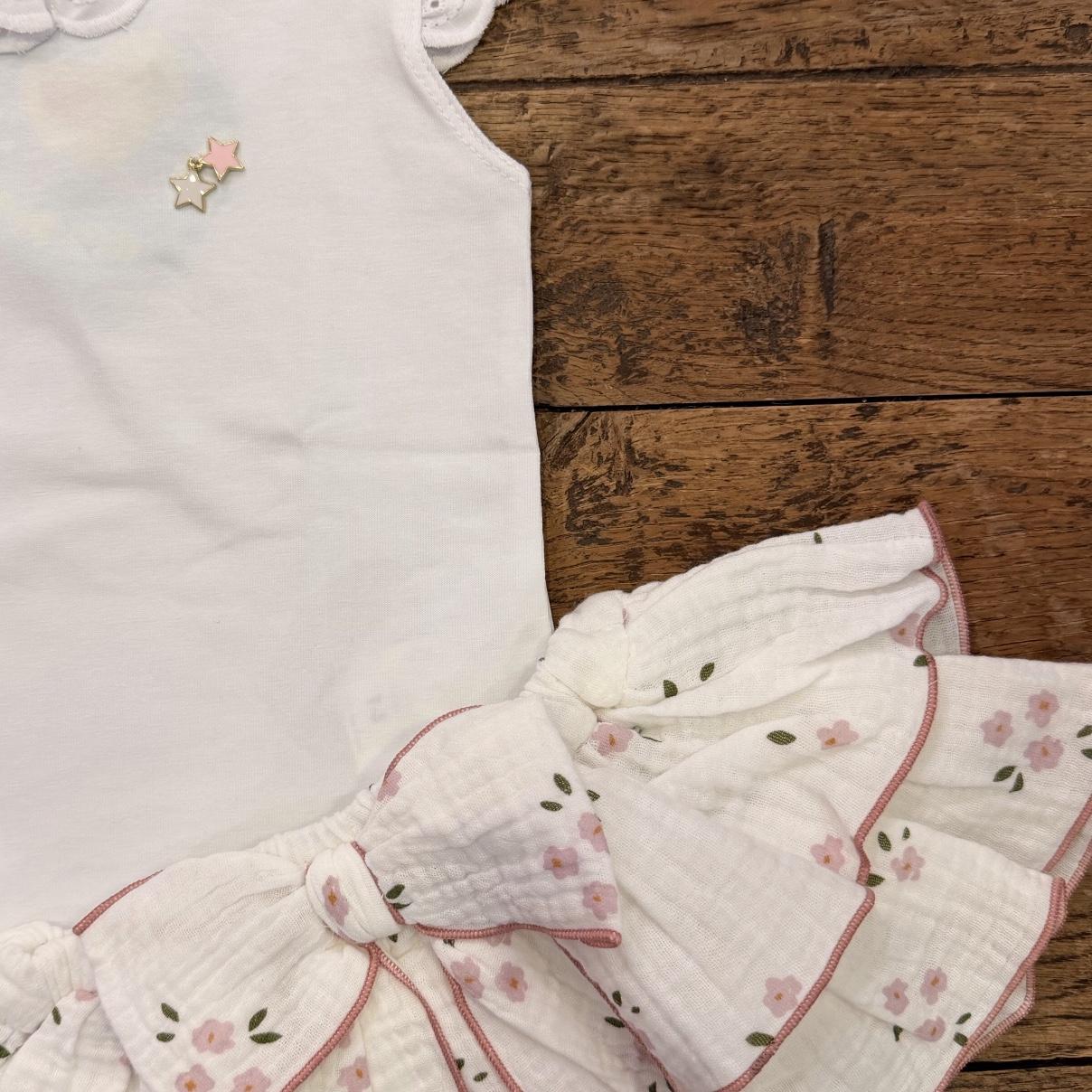 Conjunto niña: Camiseta blanca, cuello y mangas volante, estrellitas. Braguita volantes, bambula blanca, florecitas. Repulgo rosa. Lazos.