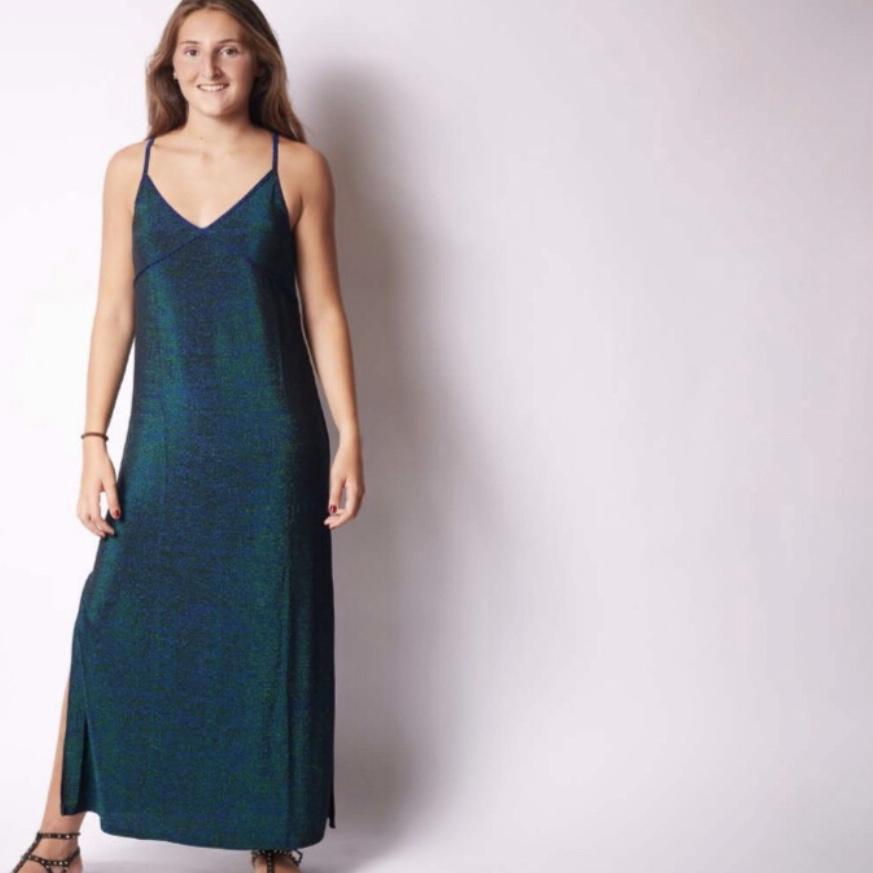 Vestido largo, tirantes. Lurex azul y verde