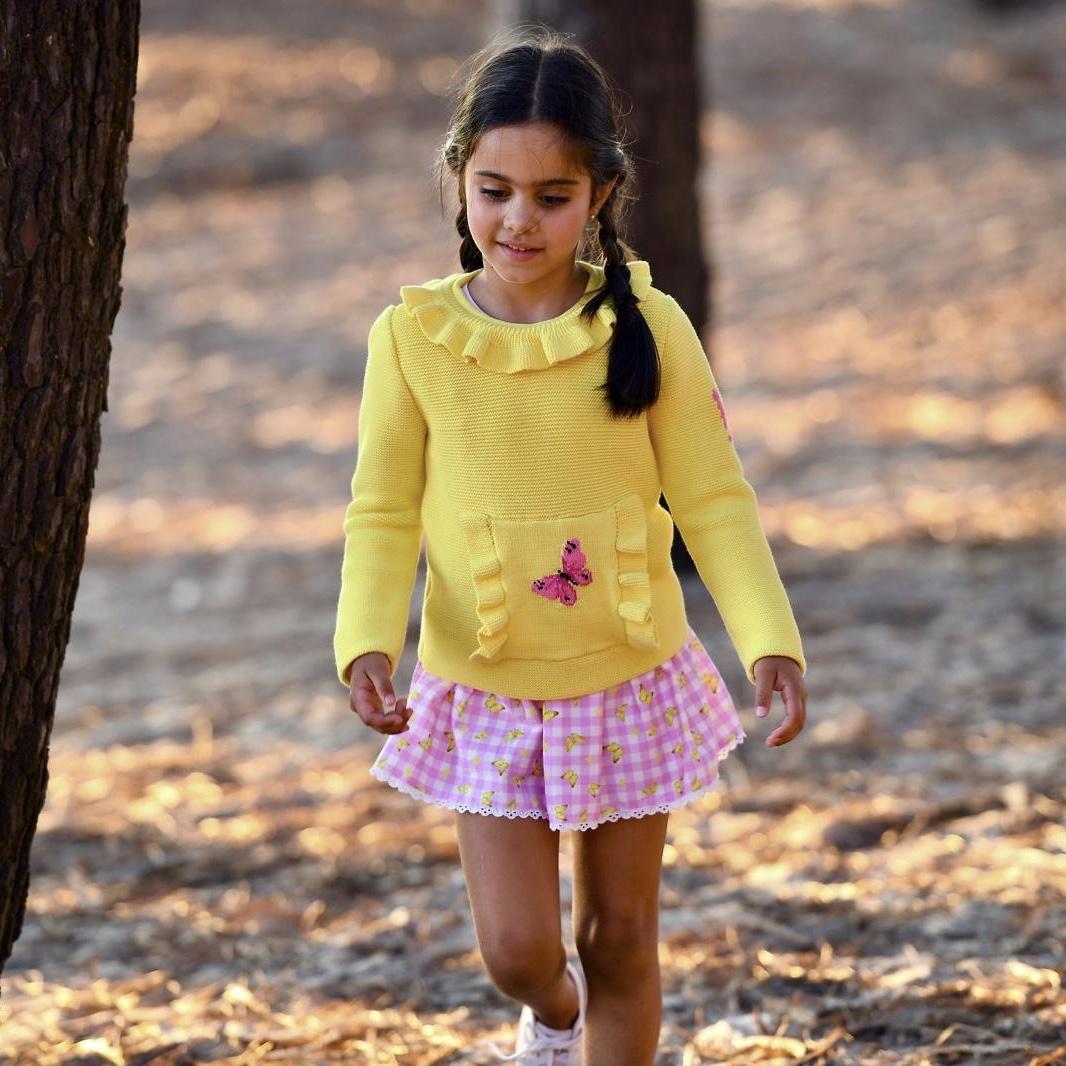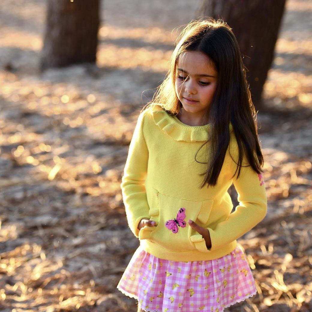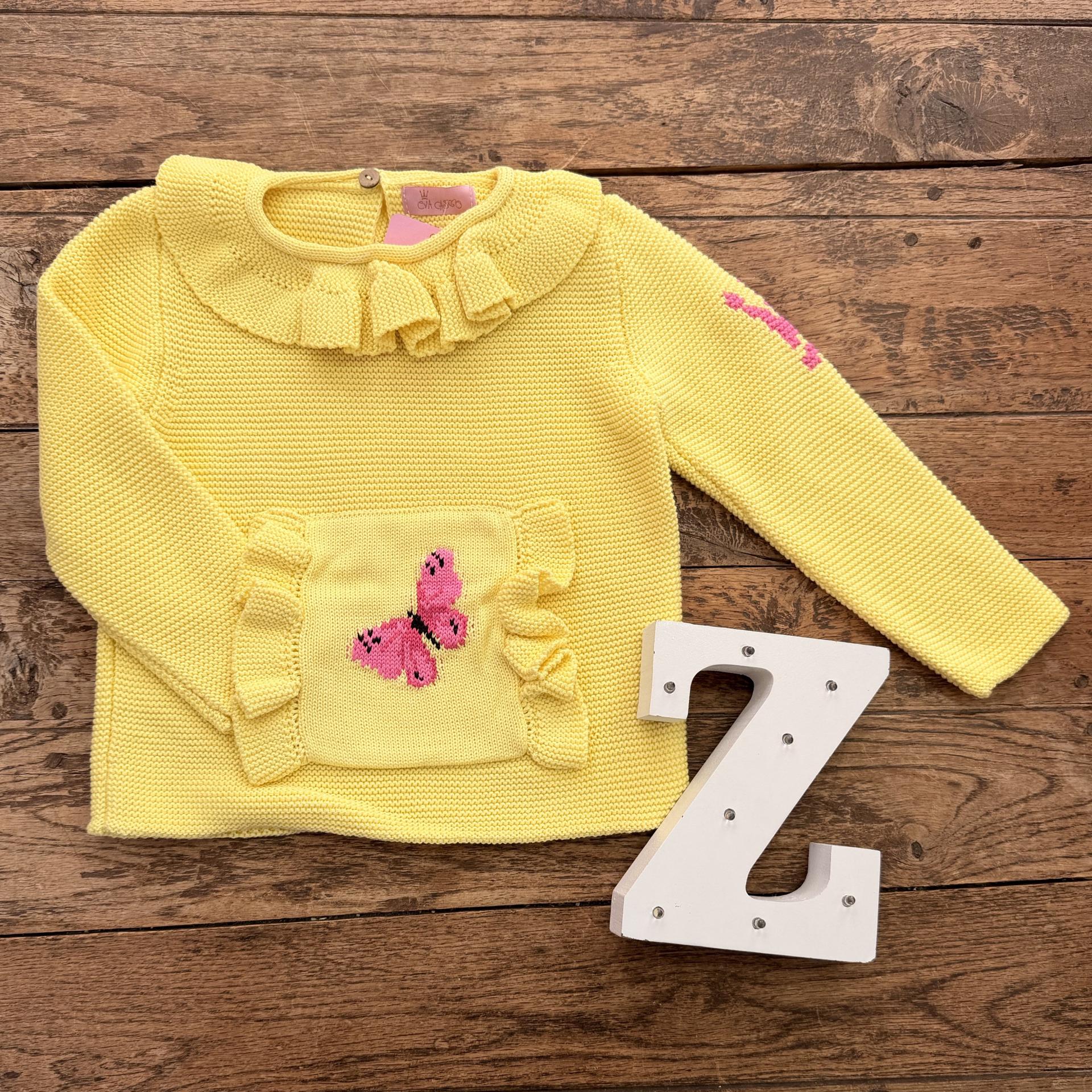 Jersey niña, punto amarillo, mariposa y corona fucsia. Bolsillo canguro volante. colección Mariposas.