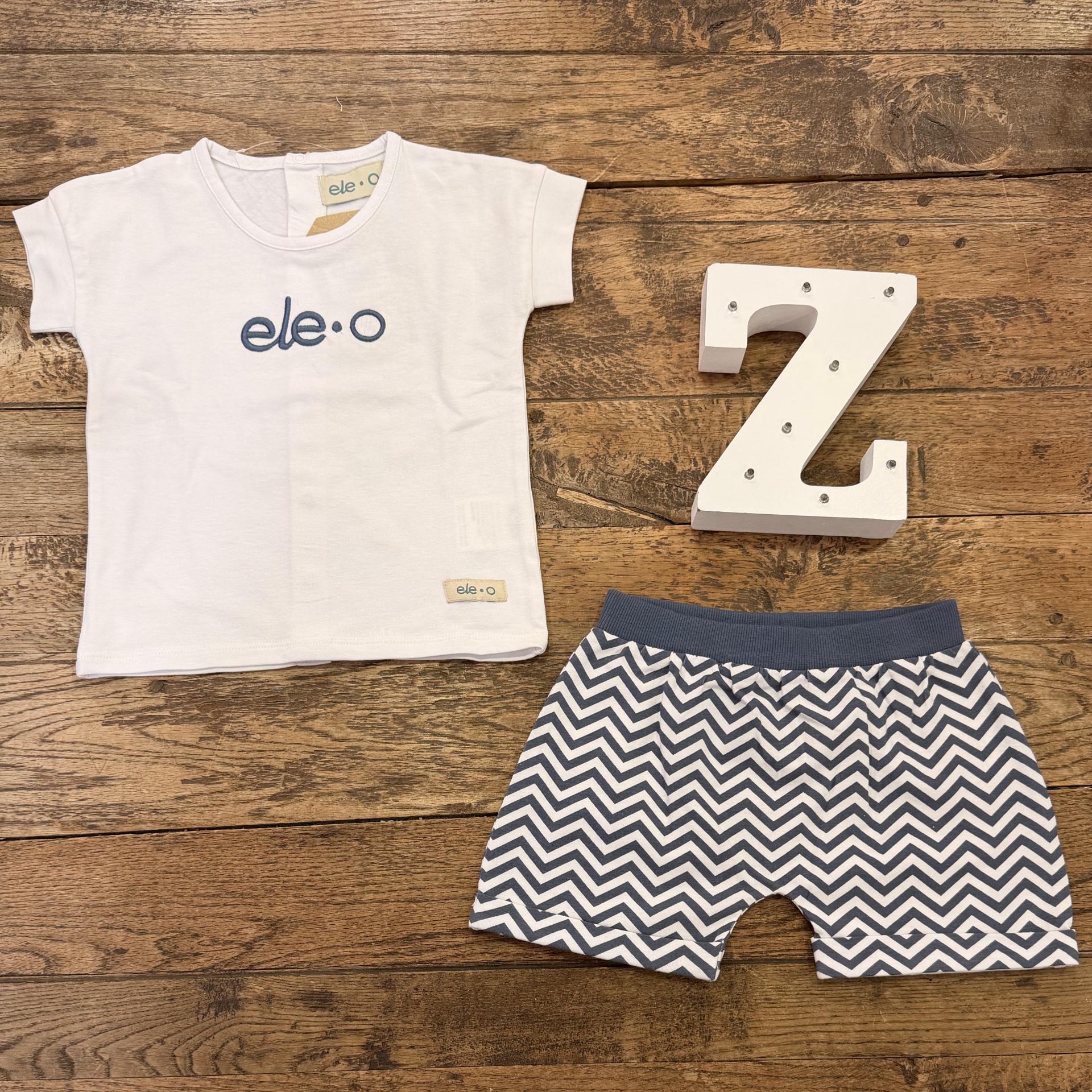 Conjunto niño, bebé, algodón. Camiseta blanca, corchetes en la espalda. Bermuda zigzag azul marino