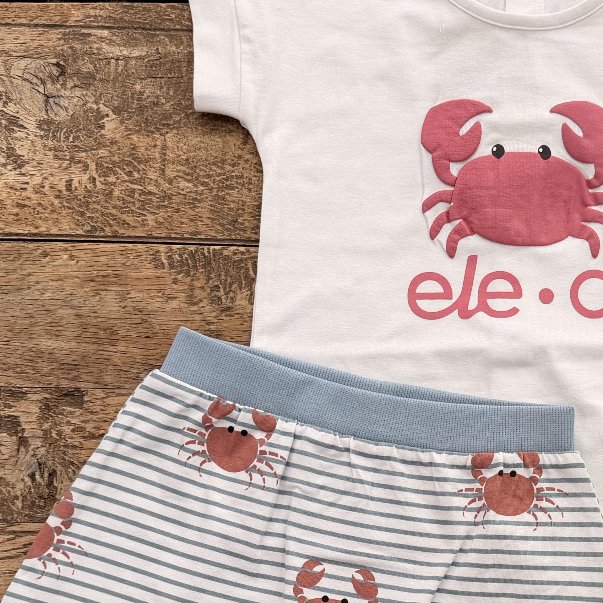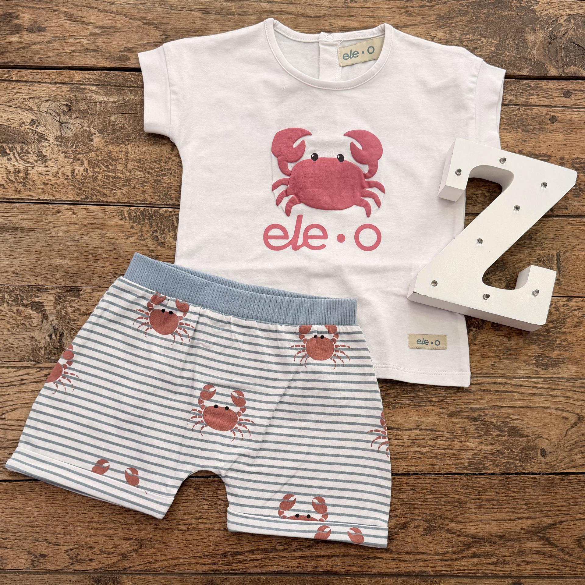 Conjunto niño, bebé. Algodón. Camiseta blanca, con cangrejo, corchetes en la espalda. Bermuda rayas azul azafata y cangrejos